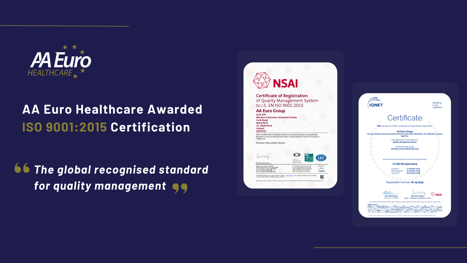 AA Euro Healthcare have achieved ISO Quality certification representative of the highest quality in recruitment standards. Our commitment to excellence is unmatched and we continuously refine our processes to ensure you receive a premium service.